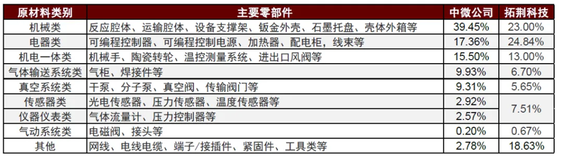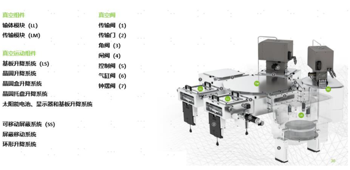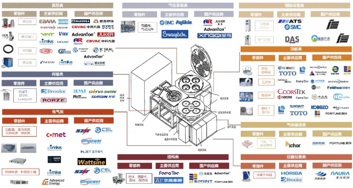 1)机械类:反应腔体、运输腔体、设备支撑架、钣金外壳、碳化硅淋浴头上电极、陶瓷镀膜上电极、静电吸盘下电极、石墨图盘、壳体外箱等;2)气体输送系列类:气柜、焊接件等;3)电气类:可编程控制器、I/O模块、AC模块、DC模块、工业电脑、可编程控制电源、加热器、配电柜、线束等;4)机电一体类:机械手、陶瓷转轮、消防报警灭火装置、温控测量系统、进出口风阀;5)真空系统类:干泵、分子泵、真空阀、传输阀门等;6)气动系统类:电磁阀、接头等;7)仪器仪表类:气体流量计、压力控制器等;8)传感器类:光电传感器、压力传感器、温度传感器等。