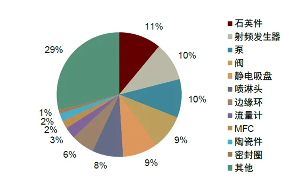 根据芯谋研究,2020年中国大陆晶圆厂直接采购零部件金额超过10亿美元,如果剔除Samsung、SK Hynix、台积电等境外厂商在中国大陆的产线,中国本土晶圆厂(中芯国际、华虹集团、长江存储、合肥长鑫等)直接采购零部件金额约4.3亿美元,主要包括石英件、射频发生器、泵、阀、静电吸盘、喷淋头、边缘环、流量计、MFC、陶瓷件、密封圈。其中,真空类零部件(泵、阀门、密封圈)采购占比合计达20%。